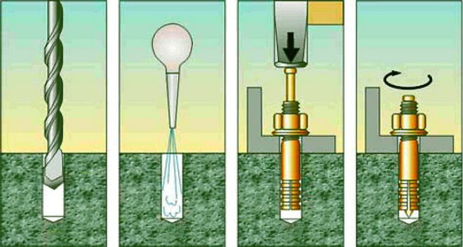 • Установка анкера. Крепеж погружается в отверстие. При его установке не должно возникать затруднений. Если болт продвигается с большим усилием, углубление расширяется на 1 мм.
